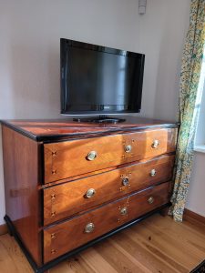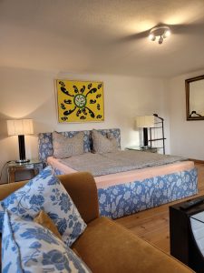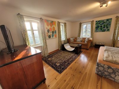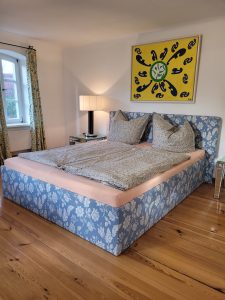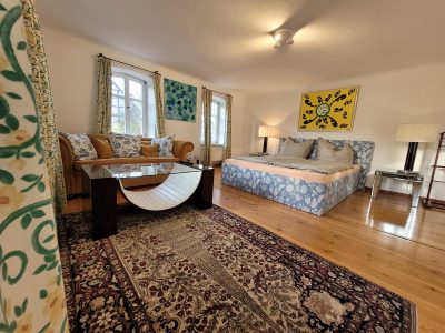 Das Zimmer Gartenblick ist ideal für Gäste, die ein helles, ruhiges und großzügiges Doppelzimmer auf dem Land suchen – mit Platz zum Entspannen und dem besonderen Flair eines alten Hofes.