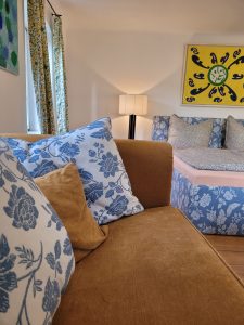 Im Mittelpunkt steht das bequeme Doppelbett, ergänzt durch ein gemütliches Sofa, das zum Lesen, Entspannen oder einfach zum Innehalten einlädt. Dieses große Doppelzimmer vereint ländlichen Charme mit einem Hauch von Behaglichkeit – ideal für Paare, die etwas mehr Platz und Ruhe genießen möchten.