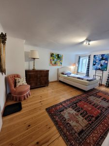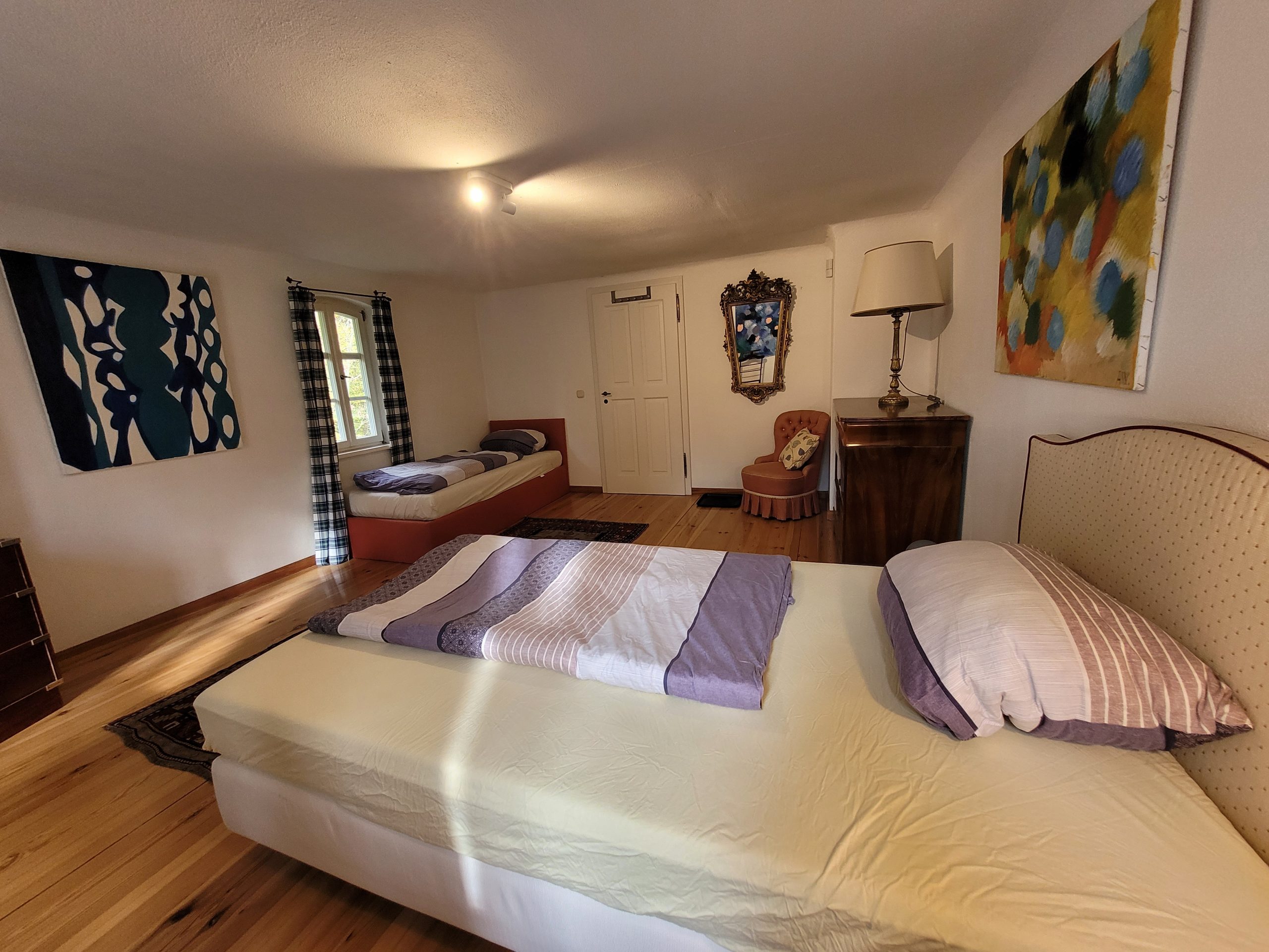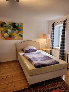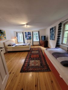 as Zimmer Waldblick liegt im Obergeschoss des Landquartiers und bietet einen ruhigen Blick in den alten Schlossgarten von Friesenhausen. Helle Farben, natürliche Materialien und zwei gemütliche Einzelbetten schaffen eine freundliche Atmosphäre, in der man sofort abschaltet. Ideal für Freund:innen oder Reisende, die die Ruhe des Dreiseithofs und die Nähe zur Natur genießen möchten.