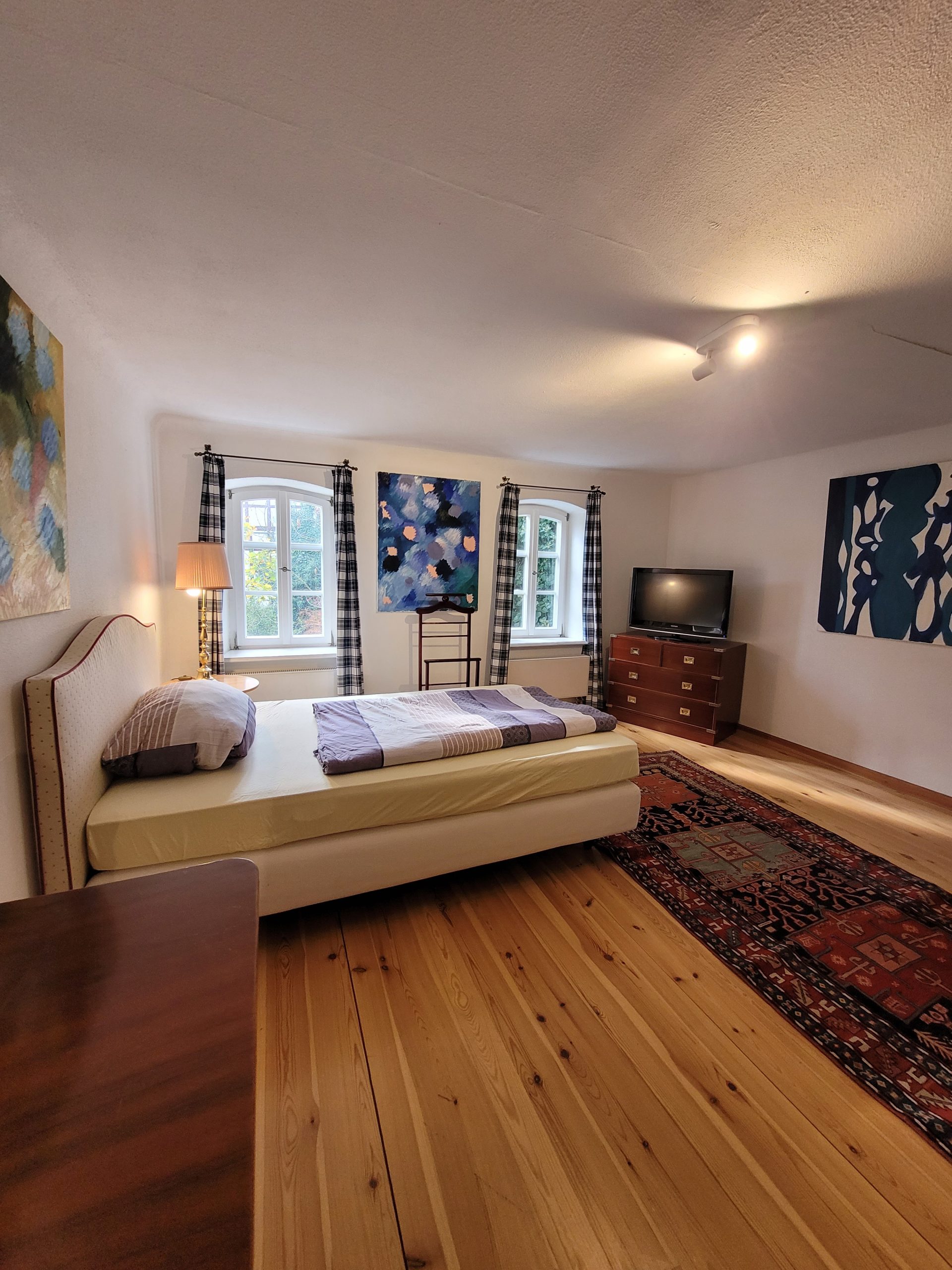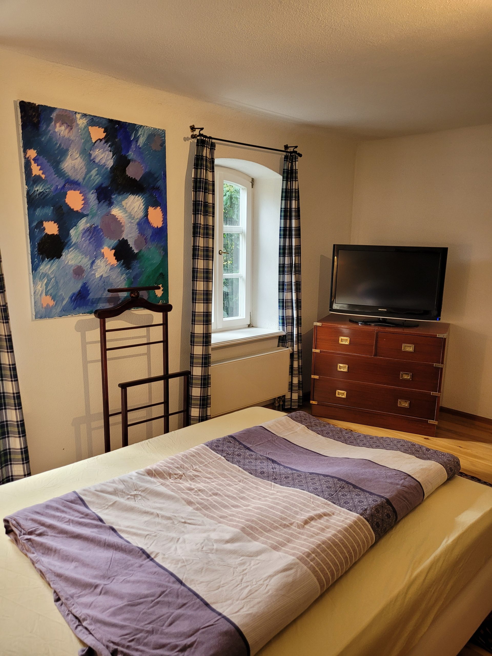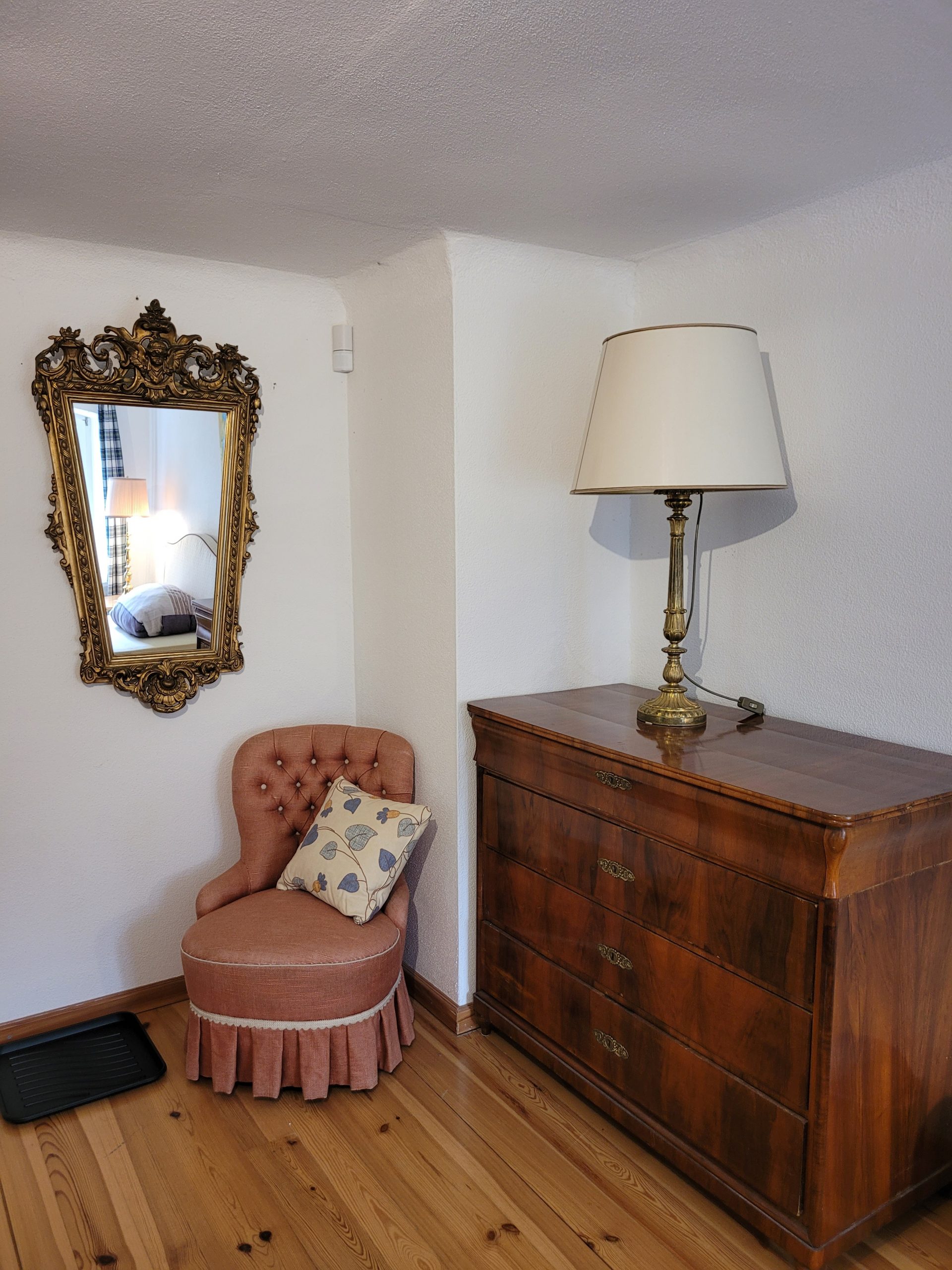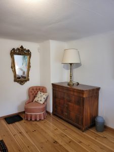 Das Zweibettzimmer Waldblick liegt im Obergeschoss des Landquartiers und trägt seinen Namen wegen seines besonderen Ausblicks: Von hier aus blickt man direkt auf den alten Baumbestand des angrenzenden Schlossgartens von Friesenhausen. Wenn morgens die Sonne durch die Blätter fällt und Vögel zwischen den Ästen singen, fühlt sich der Tag schon beim Aufwachen friedlich an.